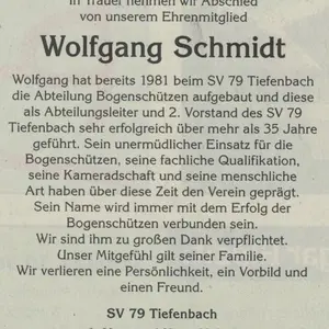 Wolfgang hat bereits 1981 beim SV 79 Tiefenbach die Abteilung Bogenschützen aufgebaut und diese als Abteilungsleiter und 2. Vorstand des SV 79 Tiefenbach sehr erfolgreich über mehr als 35 Jahre geführt. Sein unermüdlicher Einsatz für die Bogenschützen, seine fachliche Qualifikation, seine Kameradschaft und seine menschliche Art haben über diese Zeit den Verein geprägt. Sein Name wird immer mit dem Erfolg der Bogenschützen verbunden sein. Wir sind ihm zu großen Dank verpflichtet. Unser Mitgefühl gilt seiner Familie. Wir verlieren eine Persönlichkeit, ein Vorbild und einen Freund.
